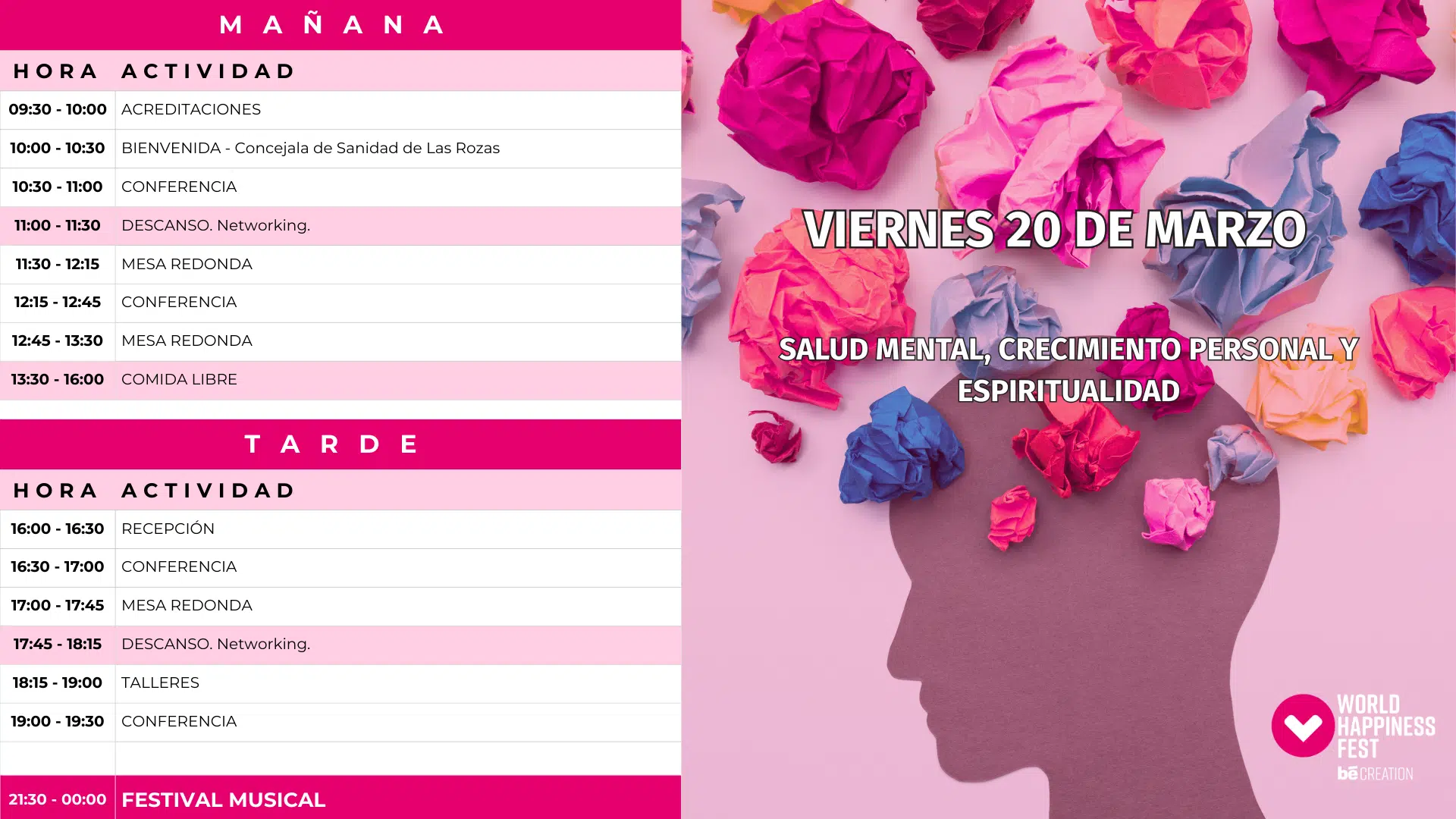 Compartimos opiniones y reflexionamos de la mano de grandes líderes del ámbito público y privado sobre diversas e importantes temáticas como: salud mental, educación, liderazgo, bienestar en el trabajo, políticas públicas, nuevas tecnologías del bienestar, desarrollo personal, impacto social, música, mindfulness, arte, cultura, gastronomía… Para ello se realizan, durante los días que dura el festival, distintas charlas, mesas de debate, talleres dinámicos, conciertos, exposiciones de arte, degustaciones y jornadas gastronómicas, deporte, sesiones de mindfulness, y muchas cosas más.