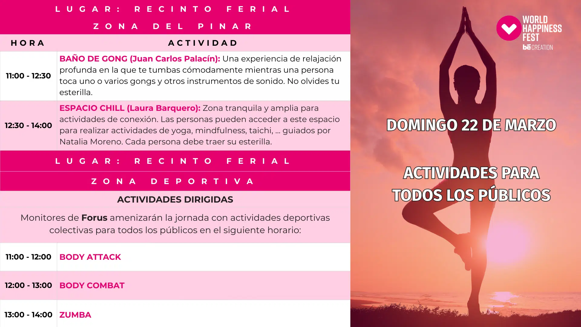 También tenemos varias actividades (talleres y happy talks = charlas breves inspiradoras) a las que te puedes inscribir de forma gratuita y que se desarrollarán en la Sala Felicidad y la Sala Libertad, sitas en el mismo Auditorio. En la agenda tienes toda la información.