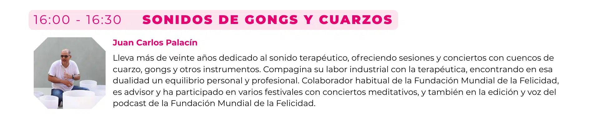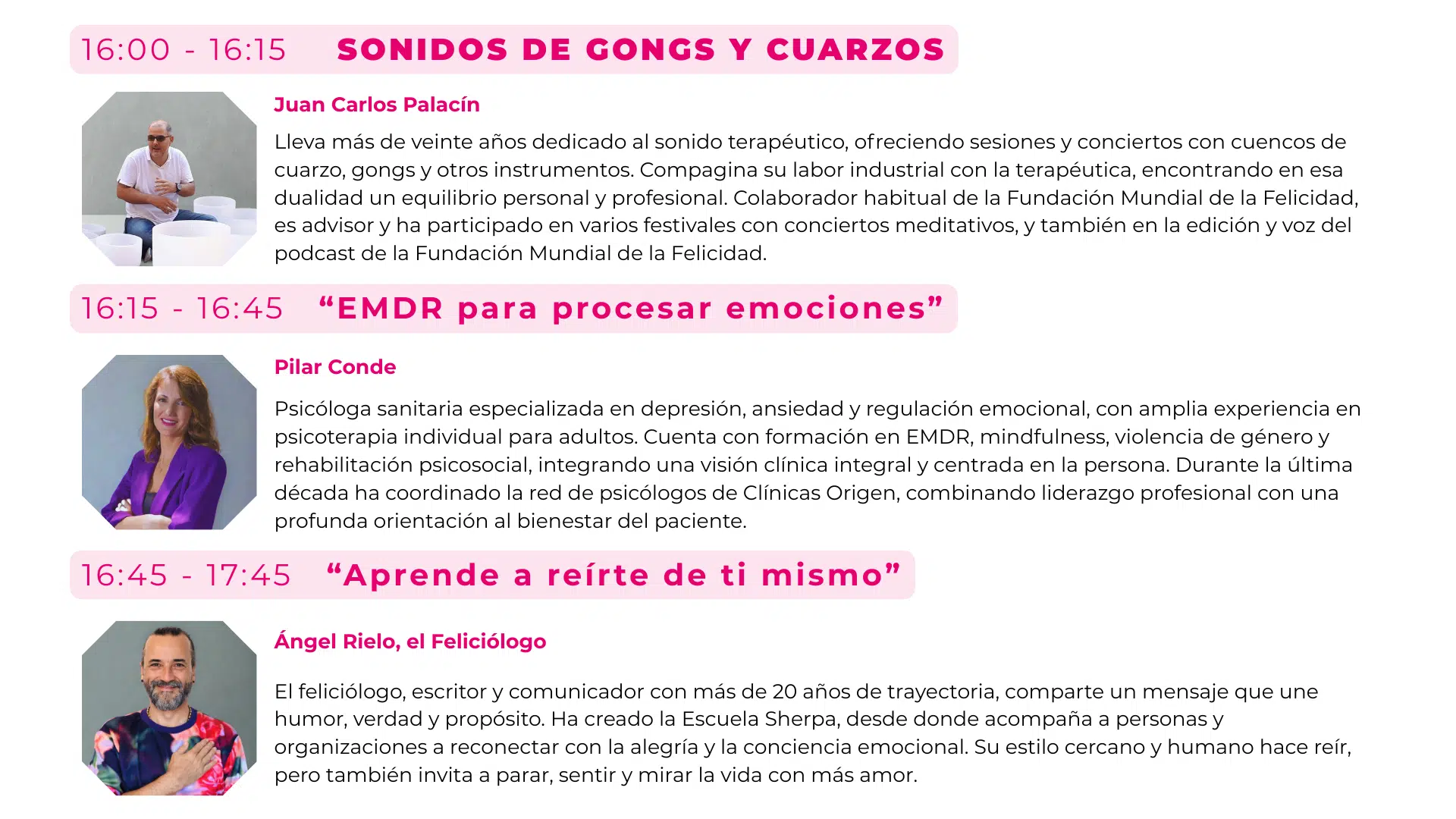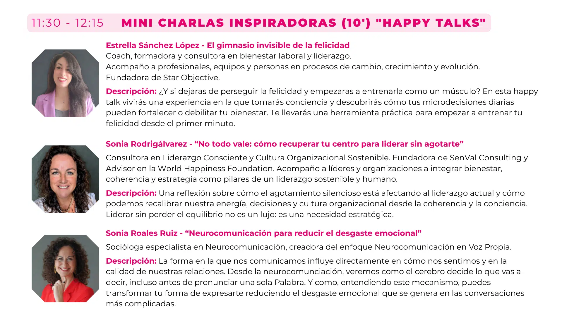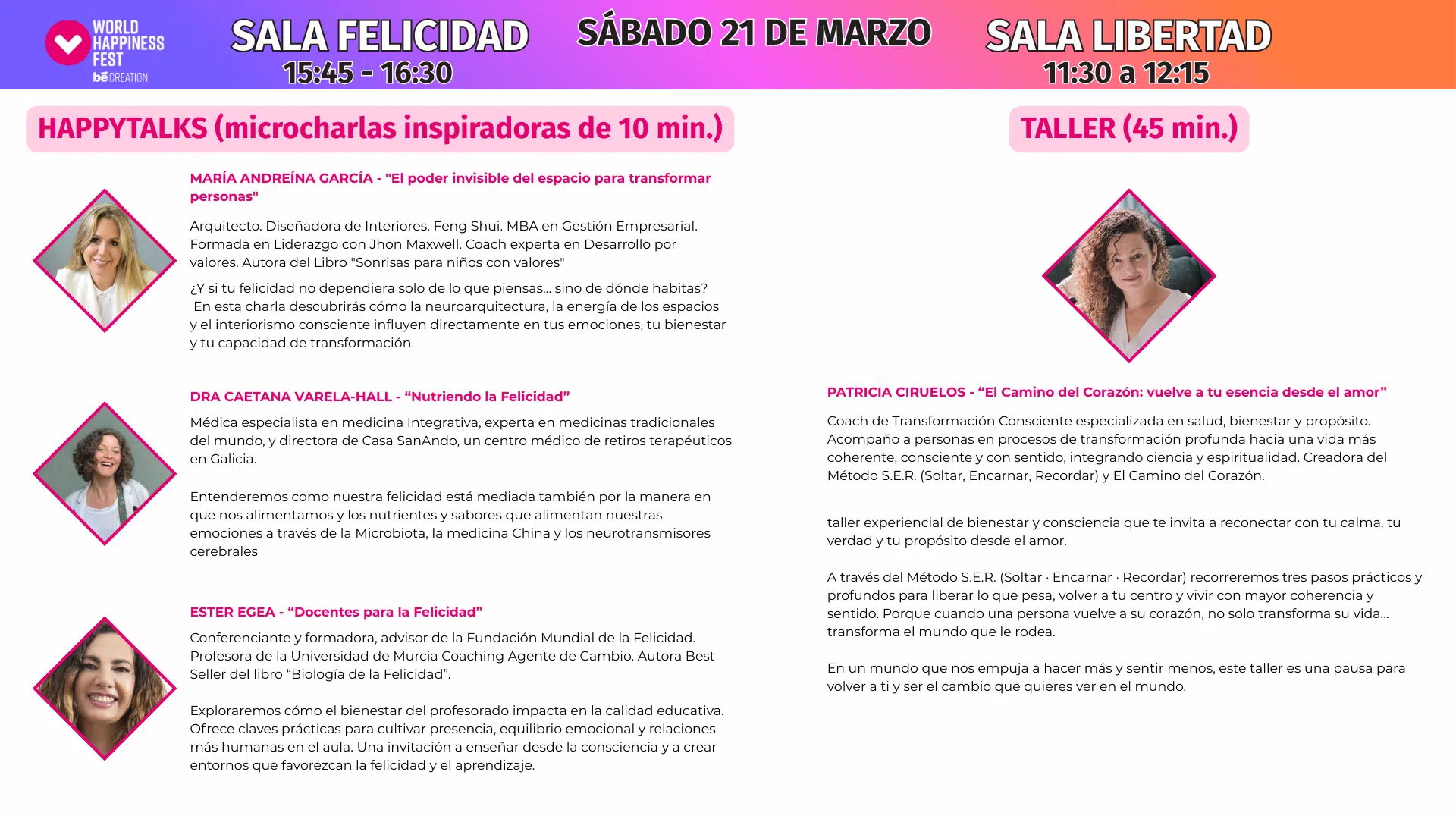 Se celebrarán unas y breves charlas inspiradoras en la Sala Felicidad de 15:45h a 16:30h. Las plazas son limitadas y por ello es necesario inscribirse previamente de forma gratuita haciendo clic AQUÍ.