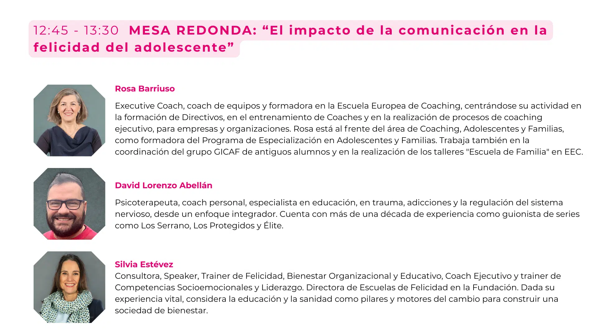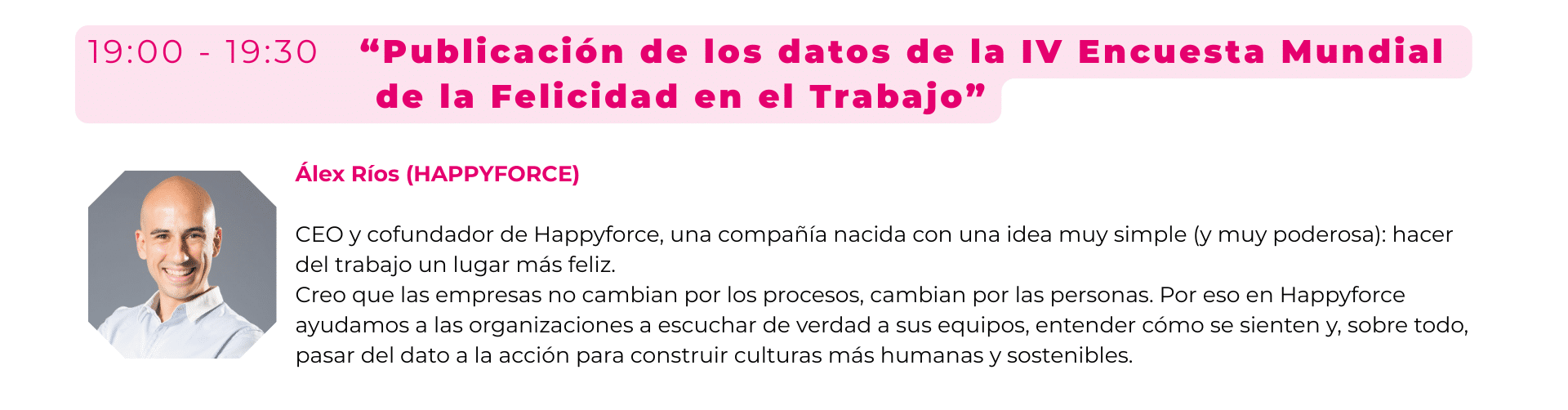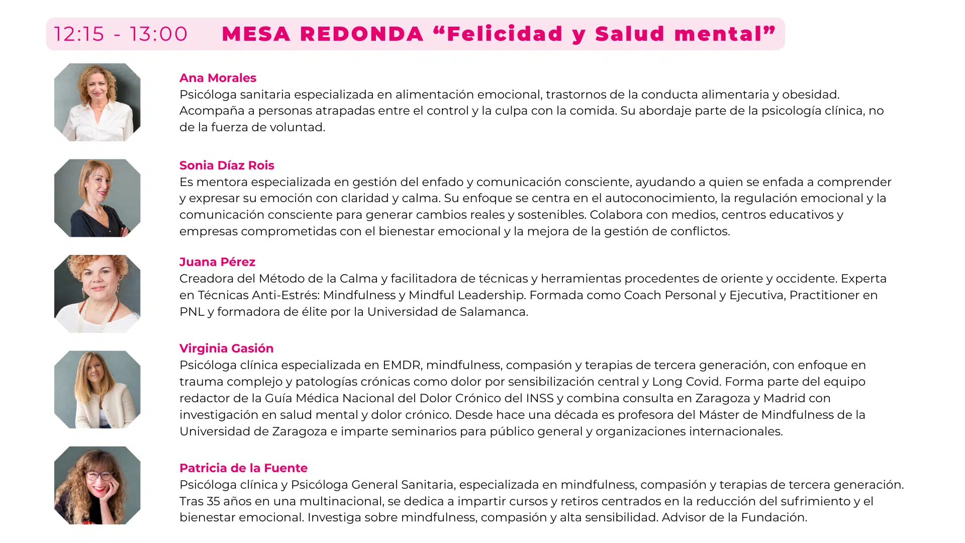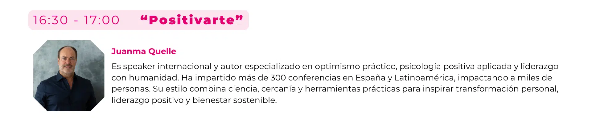 Se celebrarán unas y breves charlas inspiradoras en la Sala Felicidad de 15:45h a 16:30h. Las plazas son limitadas y por ello es necesario inscribirse previamente de forma gratuita haciendo clic AQUÍ.